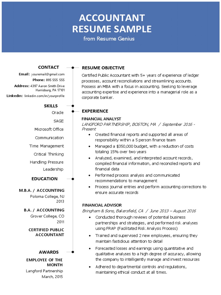 Here is the career objective from the sample resume above. Managed month end closing cycle and performed variance analysis of accounts. 4 years experience as an accountant with in depth knowledge of accounting tools procedures and transactions. For more samples do check out our websites resume sample section. Ca cma cwa having 18 years rich 33 accountant resumes in doc free premium templates. 14 years of experience in handling accounts receivable payable cash management taxation budgeting final accounts preparation credit analysis using gaap.