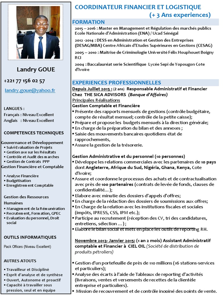 Directeur administratif et financier. 46 ans permis de conduire bordeaux 33750 france. Situation professionnelle en poste. Coordinateur pour la partie customer relationship management cognos reporting et consolidation. Recevez des cv directeur administratif et financier pour vos recrutements au niger. Cette semaine cest le cv de bruno directeur administratif et financier qui a été tiré au sort dans le cadre de notre opération améliorez votre cv en un clic.