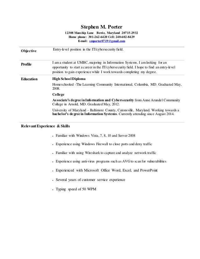 Stephen Porter Entry Level Information Cyber Security Resume