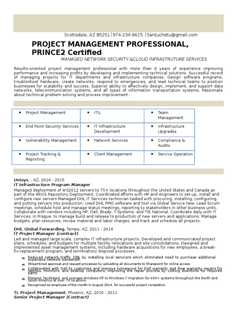Their resumes reflect such skills as conducting managed activities relating to improvements in it infrastructure and operations and leading project teams from initiation through close as assigned and within the parameters of cost quality schedule and objectives for project. A highly experienced infrastructure project manager who comes to you with a background in leading project teams through all phases of a project lifecycle. Strives to enhance. Projects include global wide area network mpls deployments spanning 35 countries ms lync global rollout to 35 counties a global infrastructure resiliencybcp project and acquisition of a top level domain gtld. Another infrastructure project manager resume. Its actually very simple.