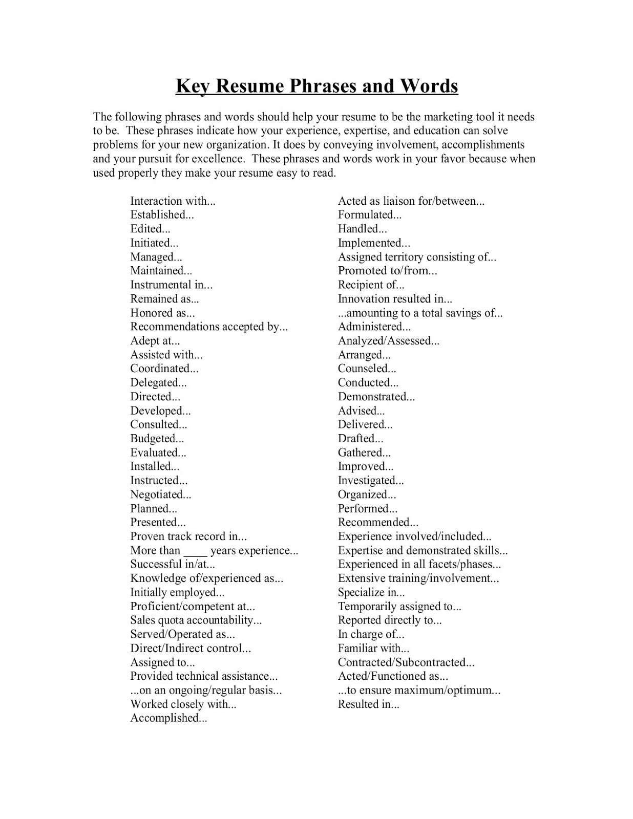 Keywords are key to finding you. But once in a while keywords can be adjectives and action verbs. Resume help is not just a set of standard phrases about your prospects it really is also an aid in realizing the benefits of a career in a large company. Companies and recruiters are searching resumes for specific keywords and key phrases to find the candidates with the skills qualifications and expertise to fulfill the job requirements. Recruiters and employers use keywords to search and retrieve e resumes in databases for available positions. Resume keywords and competencies for management job specific resume phrases for managers and executives.