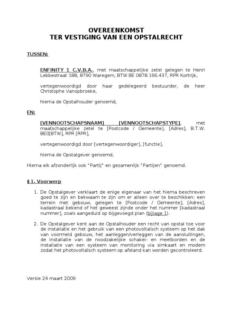 Model opstalrecht zonnestroomsysteem modelakte ondererfpacht zonnestroomsysteem modelakte opstalrecht zonnestroomsysteem dakproject variant operational lease. De modelakte vindt u hier en de toelichting op de akte vindt u hier.