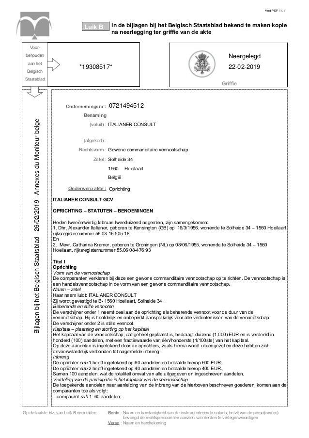 Wordt vastgelegd benoemd tot beherend vennoot. Voor een commanditaire vennootschap is de oprichting vormvrij. Eerst moet er een oprichtingsakte opgemaakt worden vervolgens moet de oprichtingsakte neergelegd worden op de griffie van de rechtbank van koophandel en tot slot volgt dan nog de registratie bij de fod economie. Ze bestaat uit minstens 2 vennoten die natuurlijke of rechtspersonen kunnen zijn. In deze vennootschapsvorm zijn er één of meer beherende vennoten en één of meer stille vennoten. V is er zowel sprake van werkende vennoten.
