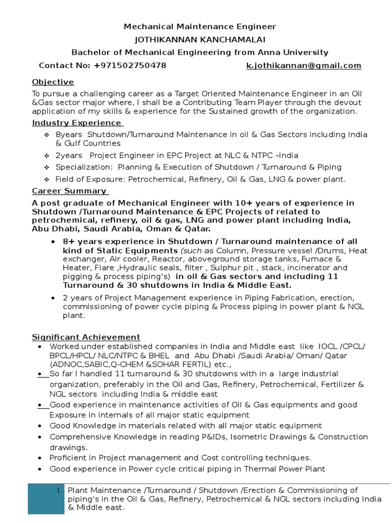 Crafting a mechanical maintenance engineer resume that catches the attention of hiring managers is paramount to getting the job and livecareer is here to help you stand out from the competition. Arranged training in repair and maintenance all property levels inside and outside ensured all maintenance and repairs are completed in timely cost effective and according to companys guidelines and financial standards. Plant maintenance planning engineer nigerian bottling company ltd a member of the coca cola hellenic group apapa lagos. View details apply for plant maintenance engineer job 16hour contract in hedge end hampshire posted by fawkes reece southern on cv librarycouk ref. Manage overall plant maintenance processes with the deployment of sap plant maintenance drives continuous improvement processes in alignment with eatb performance management methodology constantly anticipating maintenance and maintenance department needs so as to. Saved over 90000 per outage by becoming reactor coolant pump seal expert.