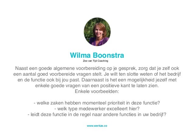De vragen kunnen ingedeeld worden in drie verschillende categorieën. Hoe streng waakt het bedrijf over het evenwicht tussen werk en privéleven. Zelf vragen stellen tijdens een sollicitatiegesprek maakt altijd een goede indruk. Houd het daarom altijd bij open vragen en zorg er ook voor dat je op de eerdere vragen door kunt vragen. Hiermee laat je niet alleen zien dat je in het bedrijf geïnteresseerd bent het levert je tevens gespreksstof op tijdens het sollicitatiegesprek. Het grote voordeel is natuurlijk dat je met het stellen van vragen veel meer informatie krijgt over het bedrijf en beter kunt inschatten of de functie én het bedrijf echt bij je past.