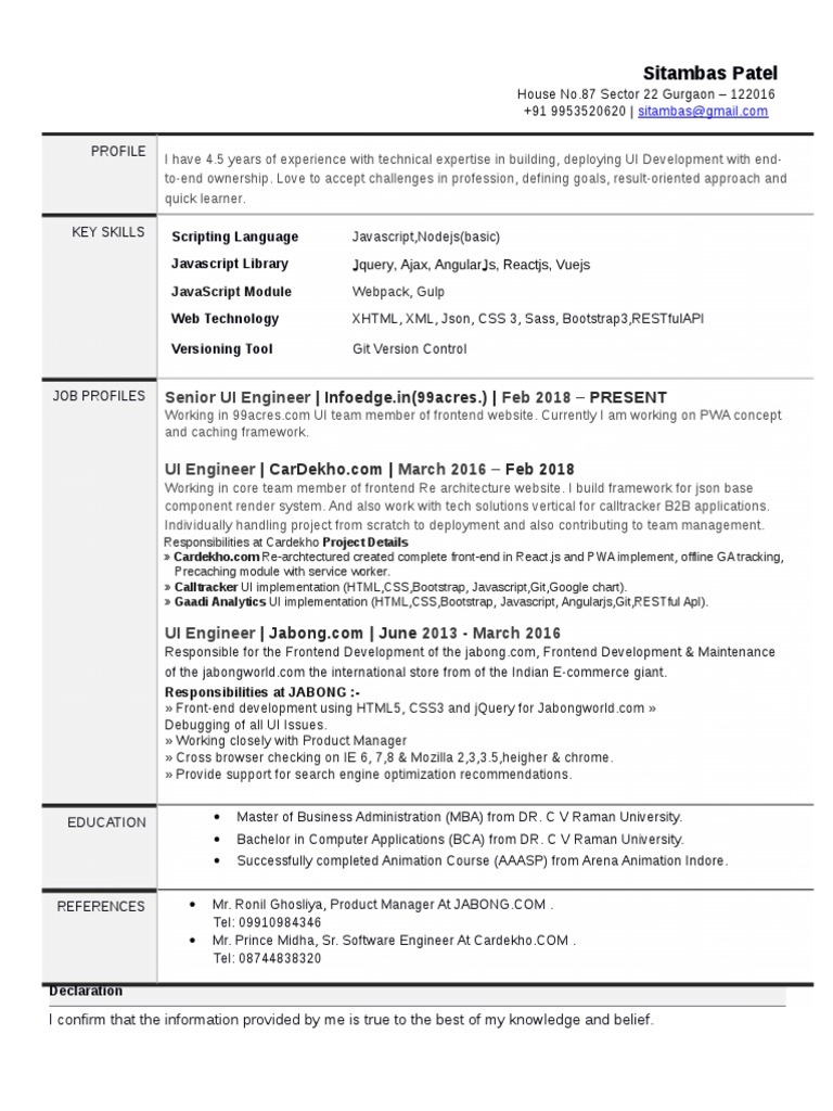Vuejs the progressive javascript framework. Check that comprehensive nodejs developer resume example to get some great ideas on how you could improve your developer cv in in minutes. Of course you can opt for an exclusive resume format and template but content does matter too. Here are several react js developer resume writing tips to make your cv impressive and persuasive. We provide original vuejs articles and tutorials through our blog and a weekly newsletter to keep you up to date with the best content from the wider vue community. Vuejs developer resumes analysis is a significant part of the recruitment process.